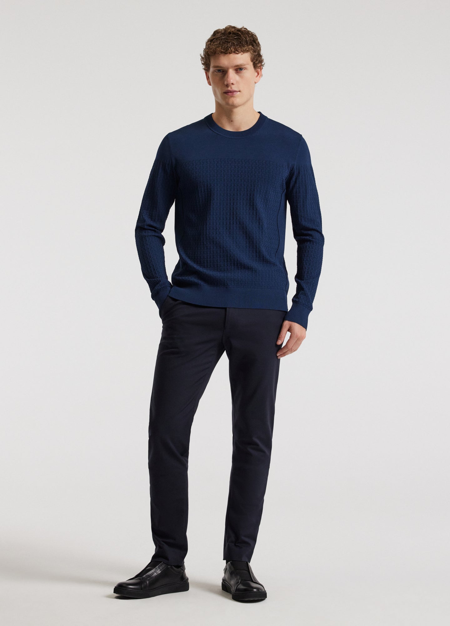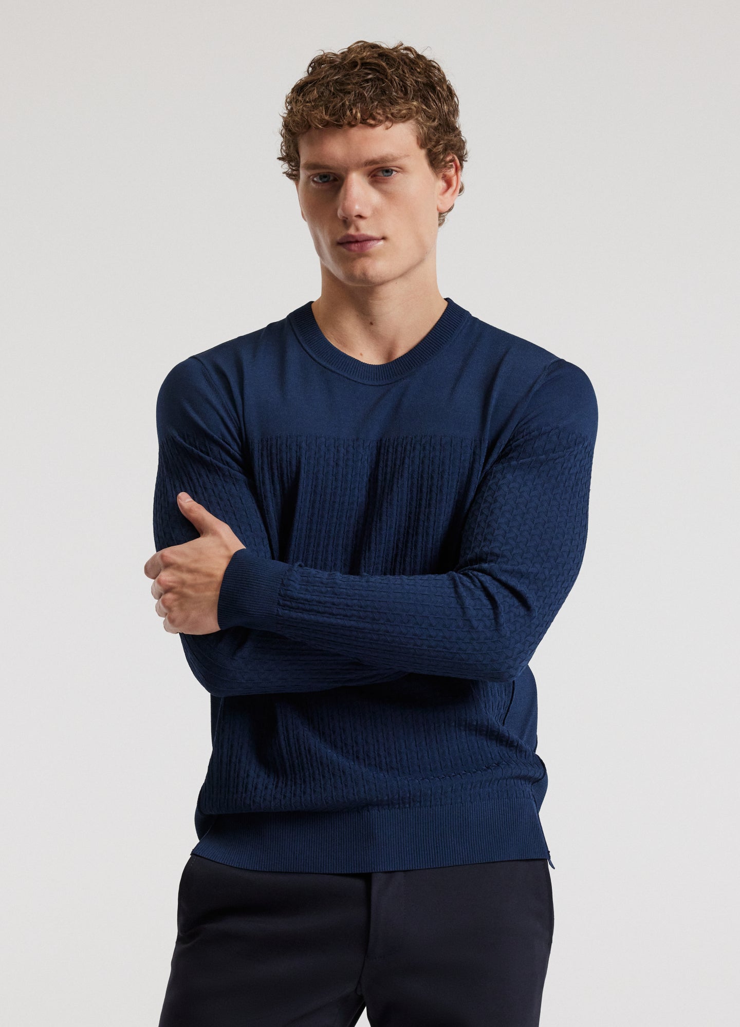 - Fancy textured stitch and jersey stitch panelling on body and sleeves