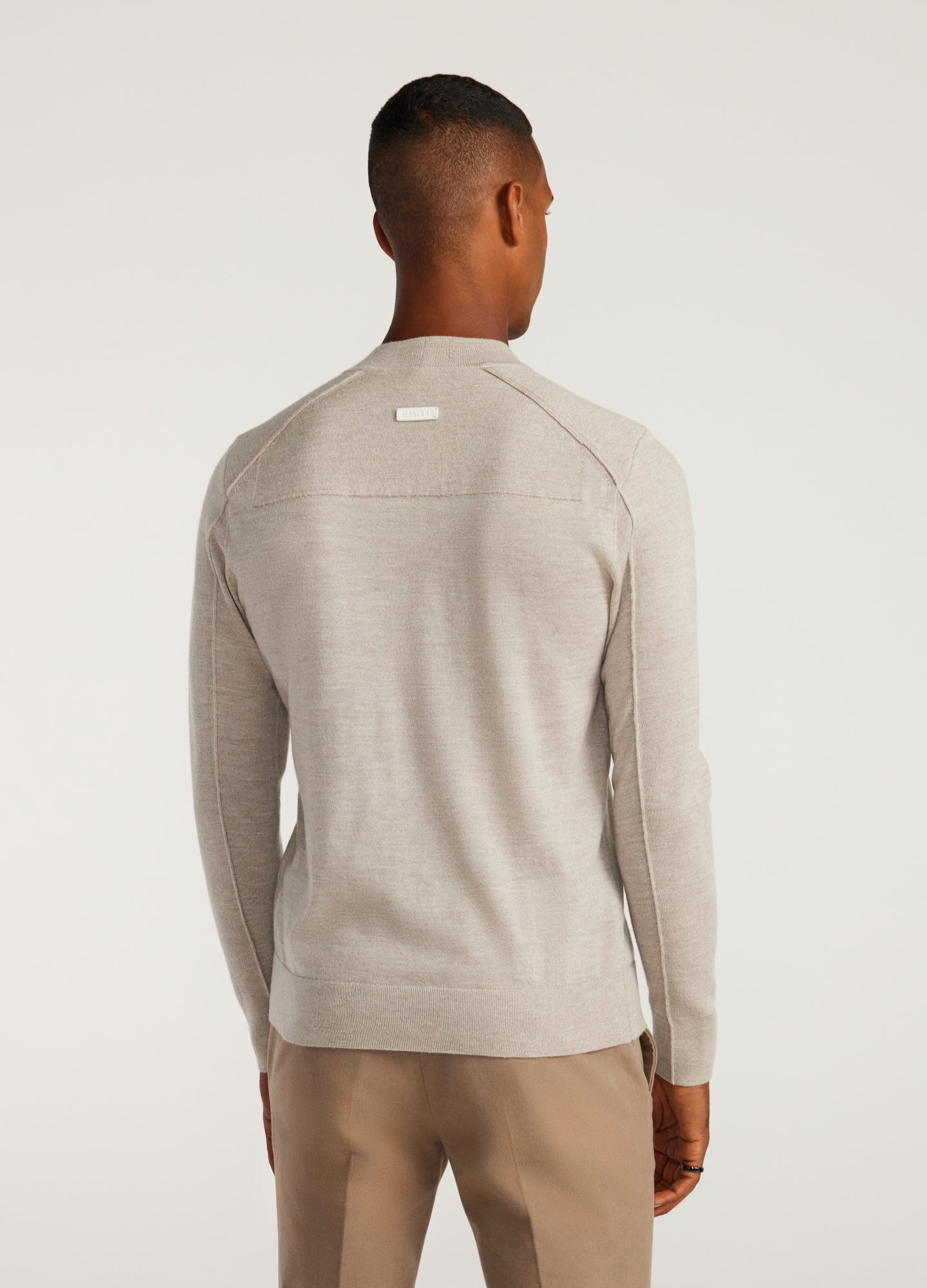 A combination of technical knit structures combined through a series of panels to create a flattering, super-fine 16-gauge mock-neck knit. Subtly punctuated with a CALIBRE leather label. The perfect autumnal stand-alone piece, or when the cooler months creep in, the mock neck silhouette becomes a great warm layering option.